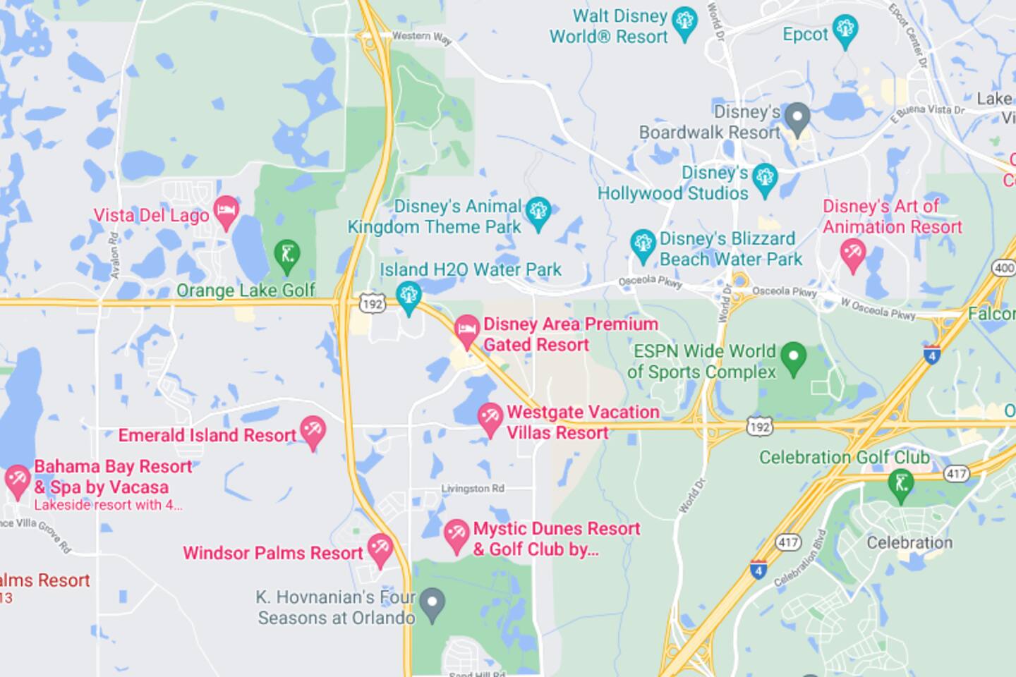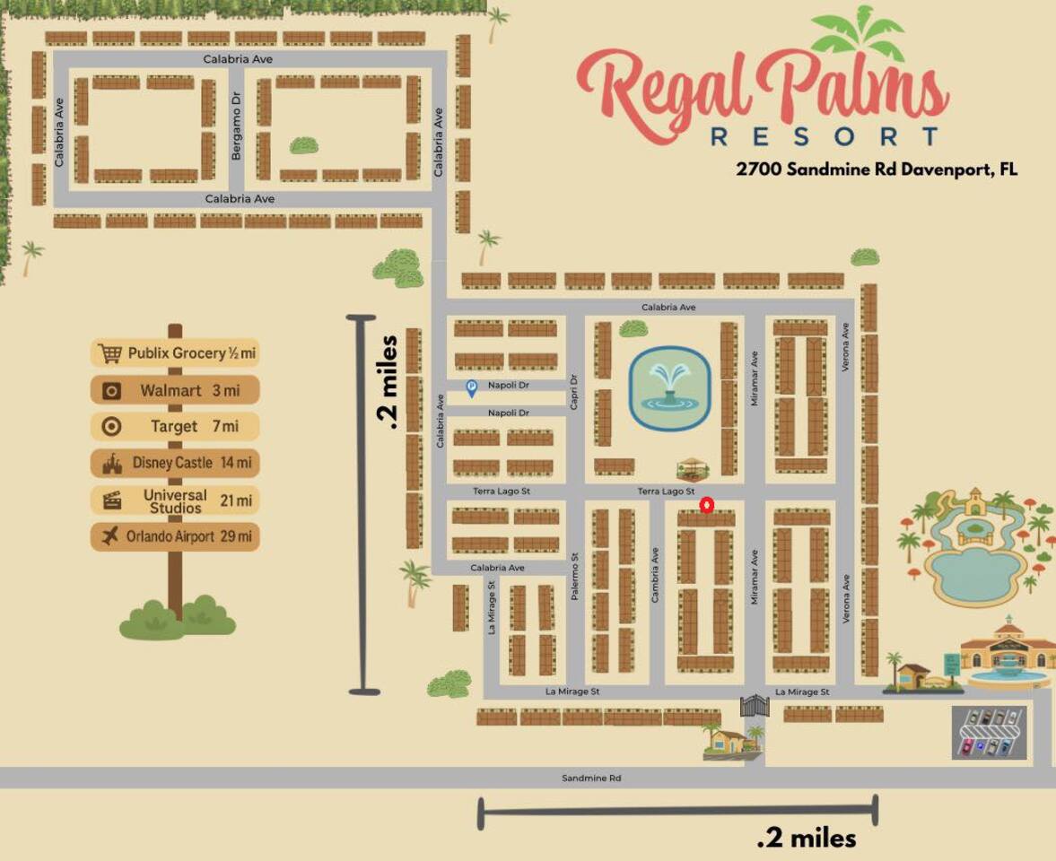 What's neayby: The resort is also conveniently located near Highland Reserve Golf Course. Located only 10 miles from Walt Disney World, there are plenty of local dining and shopping options nearby. Disney Springs offers over 100 shops and 60 restaurants along with daily and nightly entertainment. Gatorland has a free-flight aviary, petting zoo, animal shows, zip line, and a new Stompin' Gator Off-Road Adventure. For additional entertainment, Sea World is just 18 miles away, Universal Studios is 25 miles and for the younger guests, Legoland Florida is 20 miles away from the resort.