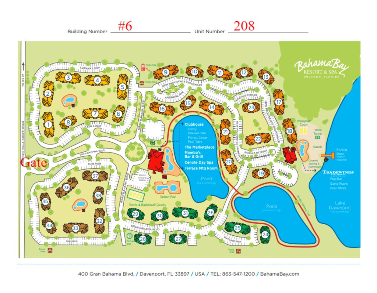 GUEST INFORMATION for Bahama Bay Resort & Spa We hope this brief document will help guests enjoy their stay at Bahama Bay. Parking / Bicycles Camper, motor homes, trailers, boats and boat trailers are not allowed on property for more than 15 days and must be parked in the designated areas. There are several large vehicle parking areas on property, please ask the Front Desk for the locations. The vehicle must fit inside the marked and identified parking spaces. Bicycles must be kept designated areas. The designated areas are the bike racks in front of the Sorry, guests are not permitted to bring pets on property, this excludes officially recognized service animals. Any guest found to be in breach of this will be asked to remove the pet from the Resort. Any officially recognized service animal on property must be registered with the Front Desk. Pool Rules Pool hours are 7:00am until 11:00pm daily for the Clubhouse and 7.00am until 10.00pm at Tradewinds pools; hours for the yellow and brown phase pools are dawn to dusk. NO Lifeguards are provided at any pool area. Swimming and use of the pool is at the user’s risk. Children under the age of twelve (12) must be supervised by an adult at all times. No Glass containers or breakable items are permitted on the pool deck for safety. All pool areas are non-smoking (this includes vaping). There is a designated smoking spot located outside of each of the pool areas. Large or oversized floats or other items of similar nature, except swimming aids, are not permitted in the pool. Use of BBQ grills on the Resort There are 3 designated BBQ and picnic areas across the resort for guests to use on a first come, first served basis. The use of BBQs outside of these designated areas is not permitted, this includes patio/balcony areas.